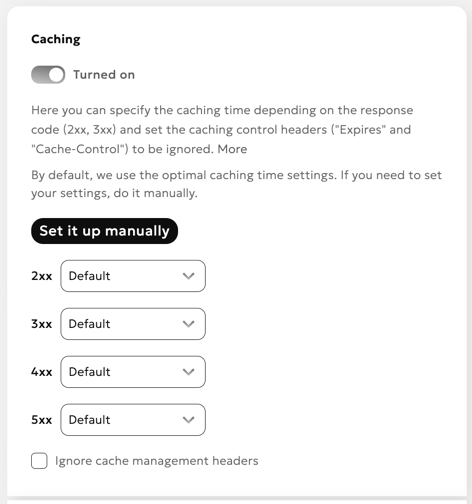 Here you can specify caching times based on response codes (2xx, 3xx, 4xx, 5xx) and set the option to ignore caching control headers ("Expires" and "Cache-Control").