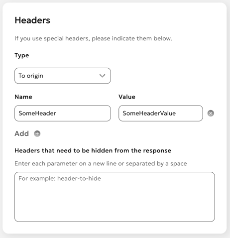 Irrespective of whether CORS authorization is enabled/disabled and its operation results, you may manually redefine any header for responses to end users. To this end, specify its name and desired value in "Headers" section. Authorization header value will be substituted with that specified by you after the CORS verification stage completion.