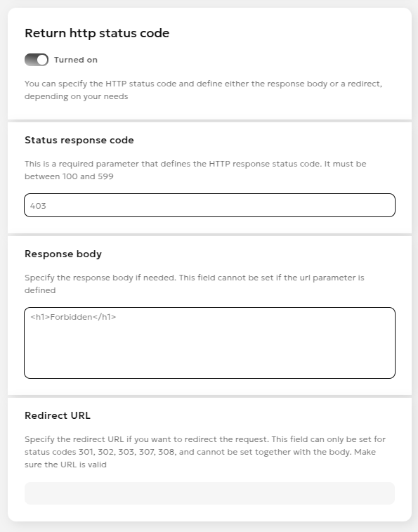 The Return HTTP Status Code option allows you to define how the CDN responds to client requests.