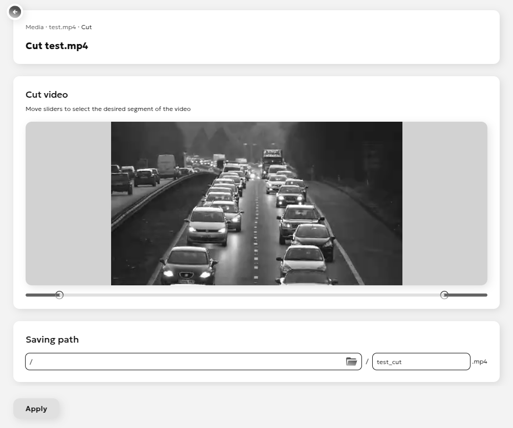 By adjusting the sliders, you can set the start and end points of the current video. After trimming, the resulting file will contain only the video within this interval.